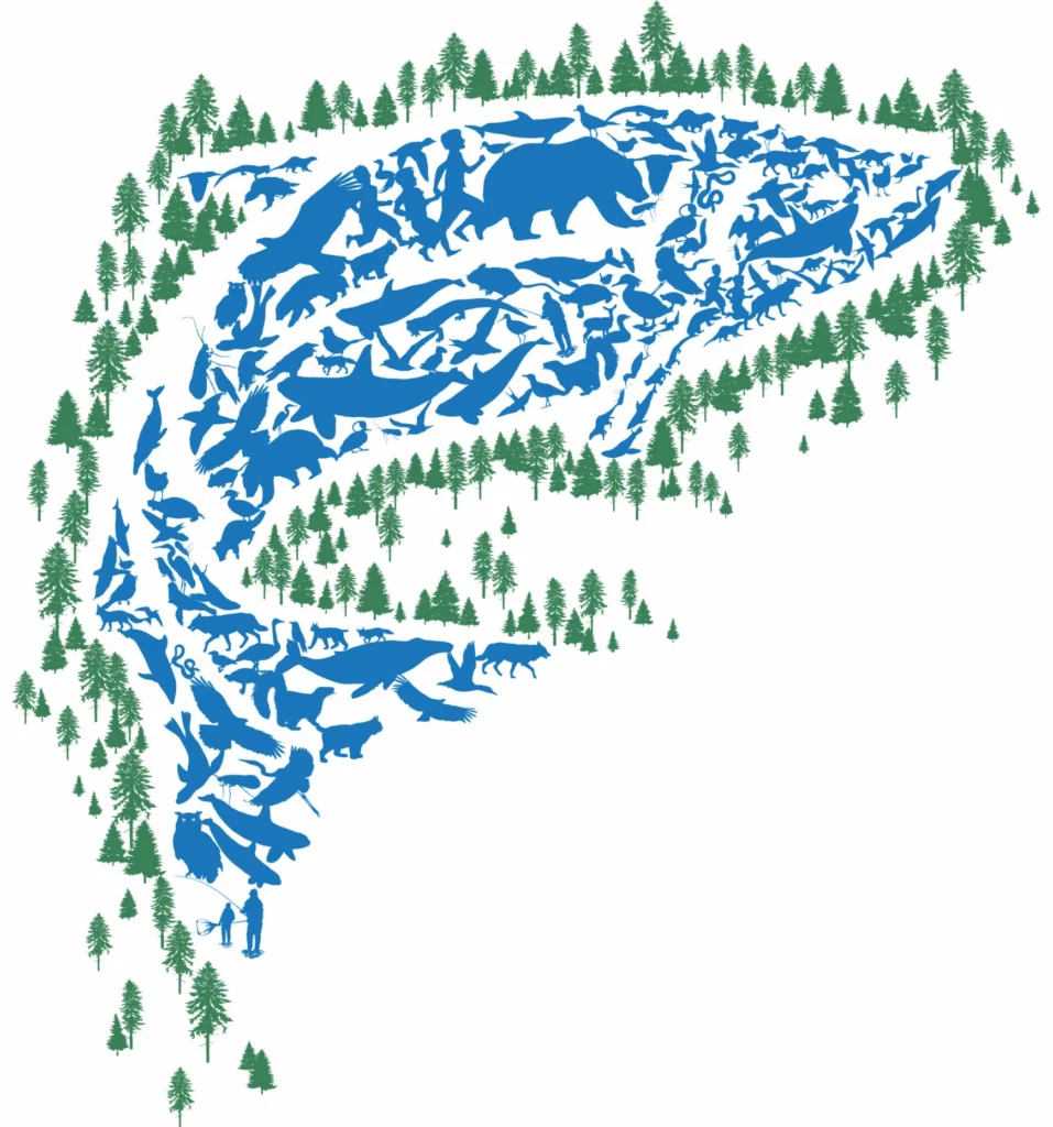 Wild Salmon Center’s keystone species logo, created by Ed Hepp, is based on a study by the Washington Department of Natural Resources. The report found that at least 137 wildlife species in the Pacific Northwest alone – from caddisflies to orcas – are predators or scavengers of salmon at some stage in their life cycle. This study underscores the importance of wild salmon as a keystone species to food webs and watershed health as they transport vital nutrients and protein from the ocean to be deposited in upstream spawning grounds after they die.