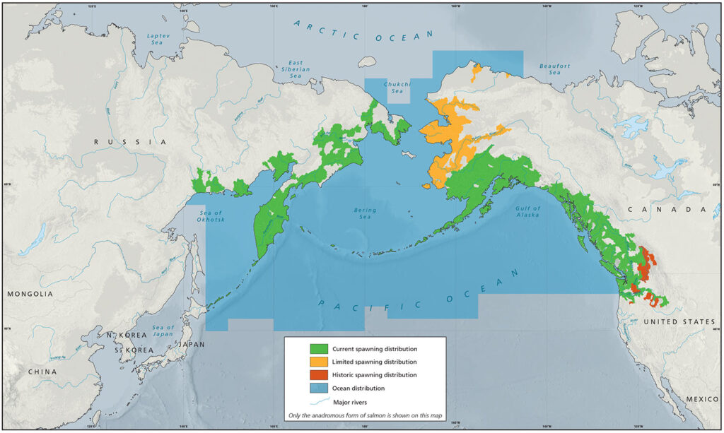 Sockeye depend largely on lake habitats for spawning and are thus more irregularly distributed across the North Pacific than are other species of Oncorhynchus. Lake habitat suitable for sockeye may be found in the geologically active Kamchatka peninsula and glaciated regions from the Kuskokwim River to the Puget Sound and interior Columbia River basin. Sockeye have one of the narrowest latitudinal ocean ranges within Oncorhynchus, limited by their sensitivity to temperature and dependence on glacial landscapes (with abundant lakes). Dams in the Columbia River basin have extirpated many inland populations.